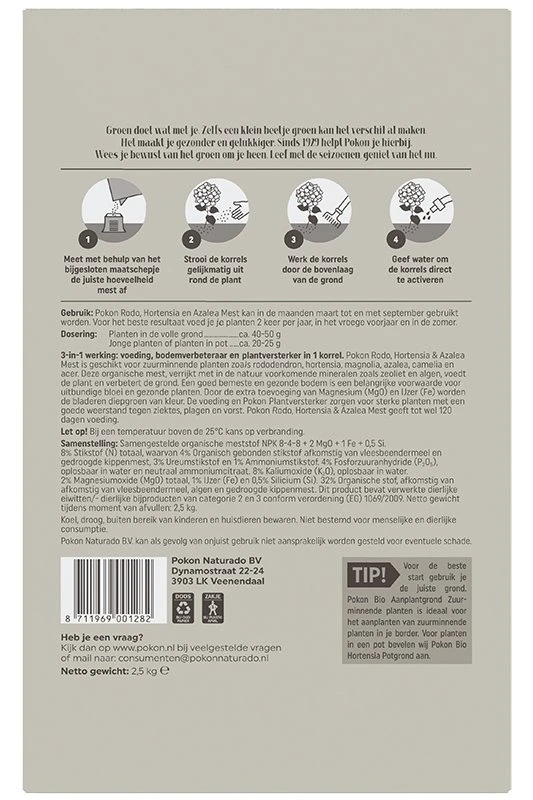 3-in-1 werking: voeding, bodemverbeteraar en plantversterker in 1 korrel. Pokon Rodo, Hortensia & Azalea Mest is geschikt voor zuurminnende planten zoals rododendron, hortensia, magnolia, azalea, camelia en acer. Deze organische mest, verrijkt met in de natuur voorkomende mineralen zoals zeoliet en algen, voedt de plant en verbetert de grond. Een goed bemeste en gezonde bodem is een belangrijke voorwaarde voor uitbundige bloei en gezonde planten. Door de extra toevoeging van Magnesium (Mg0) en IJzer (Fe) worden de bladeren diepgroen van kleur. De voeding en Pokon Plantenversterker zorgen voor sterke planten met een goede weerstand tegen ziektes, plagen en vorst. Pokon Rodo, Hortensia en Azalea Mest geeft tot wel 120 dagen voeding. Pokon Rodo, Hortensia & Azalea Mest kan in de maanden maart t/m september gebruikt worden. Voor het beste resultaat voed je je planten 2 keer per jaar, in het vroege voorjaar en in de zomer.